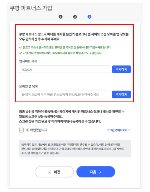 ※ 쿠팡 파트너스 웹사이트 목록에 서브 블로그 주소를 추가해야 된다.