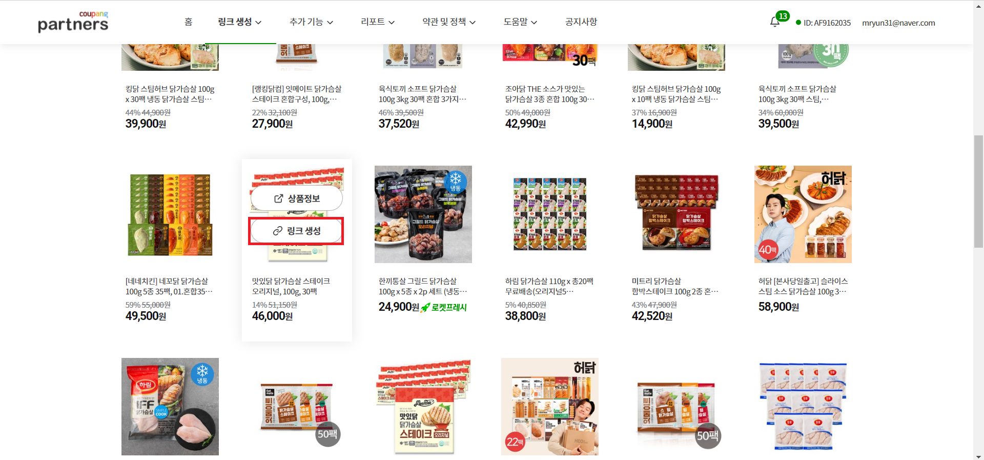 2. 소개할 상품에 마우스를 갖다 대서 ‘링크 생성’을 누른다.