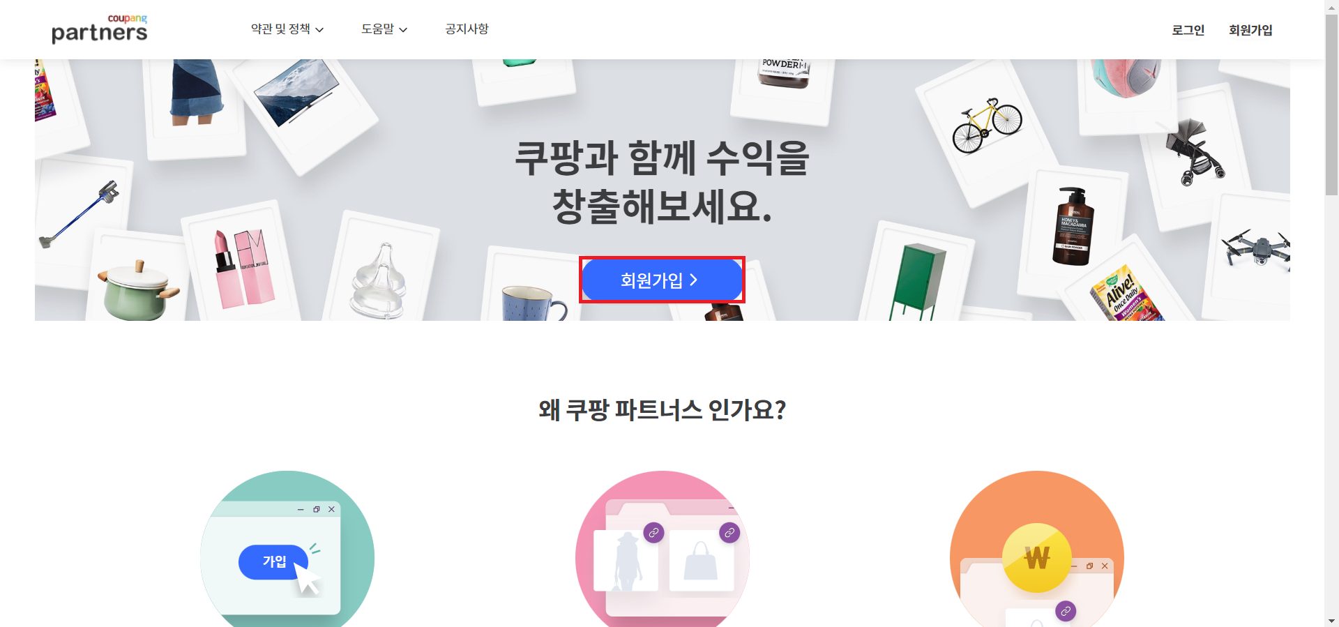 파트너스는 쿠팡 아이디를 이용해 가입이 가능하고,