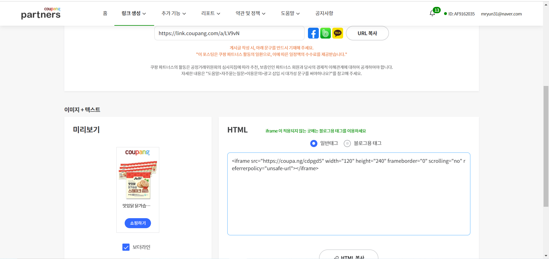 3. 단축 URL이나 HTML을 복사해서 콘텐츠에 붙인다.