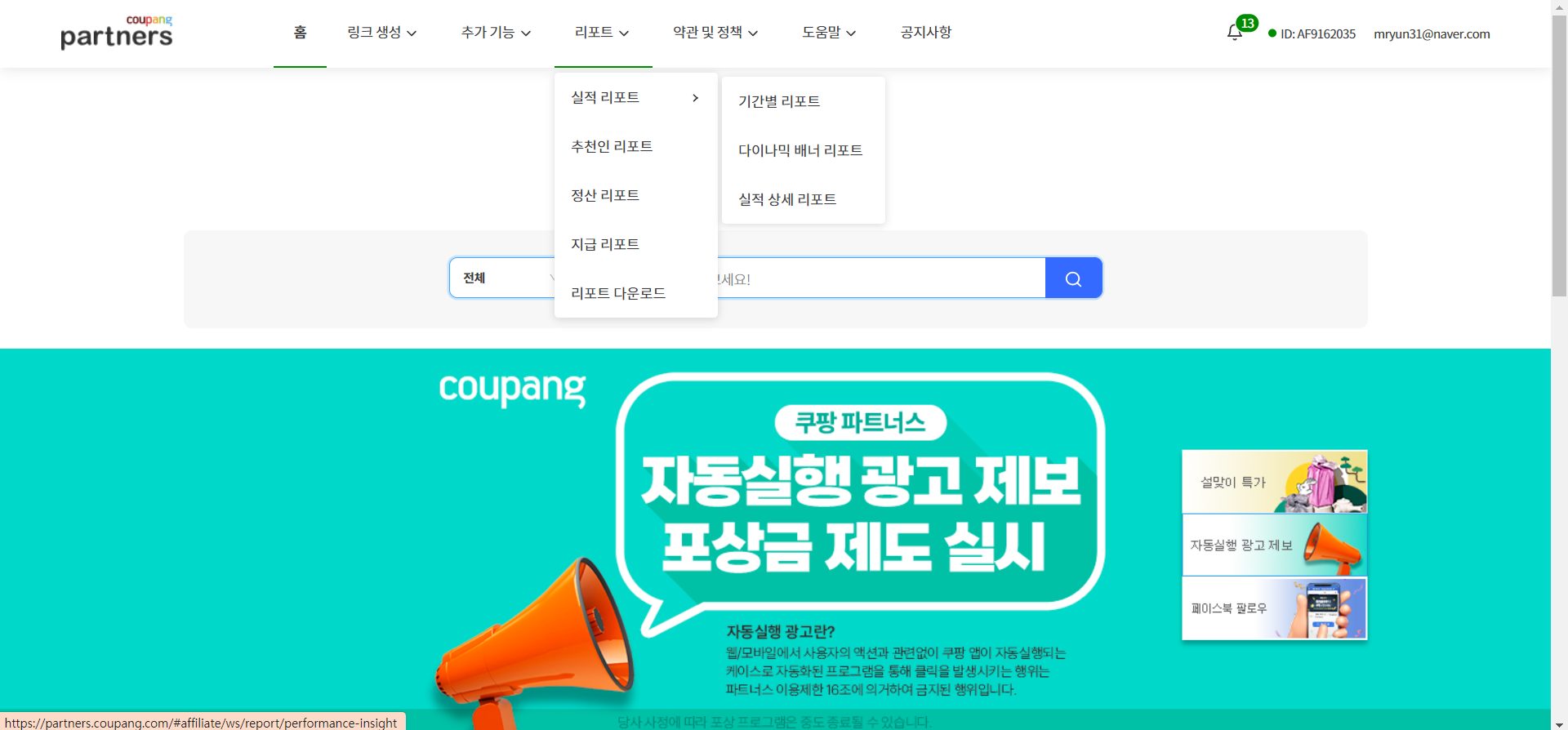 파트너스 사이트에서 판매 실적, 추천인, 정산, 지급 등의 리포트를 볼 수 있다.